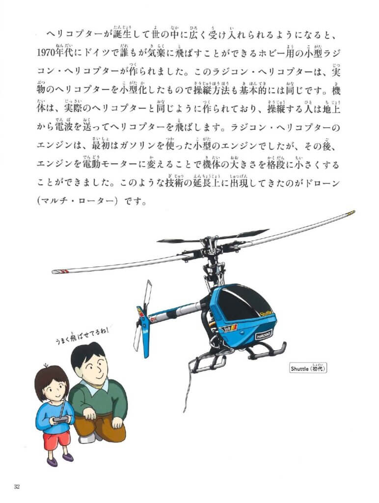 ホームInformation ’23/01 Shuttle(シャトル)が児童科学絵本に掲載されました。 2023年1月6日 福音館書店「月刊 たくさんのふしぎ 2023年1月号(第454号)ヘリコプターのしくみ(齊藤茂 文 / 山本瑞樹 絵)」に、Shuttle(シャトル)がイラストで掲載されました。 Shuttle(シャトル)は、「凄いけどカ・ン・タ・ン」のキャッチフレーズで1985年に発売されました。 1985年 初代Shuttle(シャトル) それまでのラジコン・ヘリコプターの常識「高価で組立も操縦も難しい」を工場組立とマテリアル・イノベーションで打ち破り、今でも世界中のファンに愛されています。 現在のShuttle(シャトル) 「月刊 たくさんのふしぎ」に掲載されたShuttle(シャトル)のイラストを通じて、子どもたちがヘリコプターに興味関心を持つきっかけになれば幸いです。 ヒロボーはこれからも地域社会との共生をテーマに、事業活動を推進して参ります。 関連リンク 福音館書店 月刊 たくさんのふしぎ ヒロボー商品のお買い求め方法について