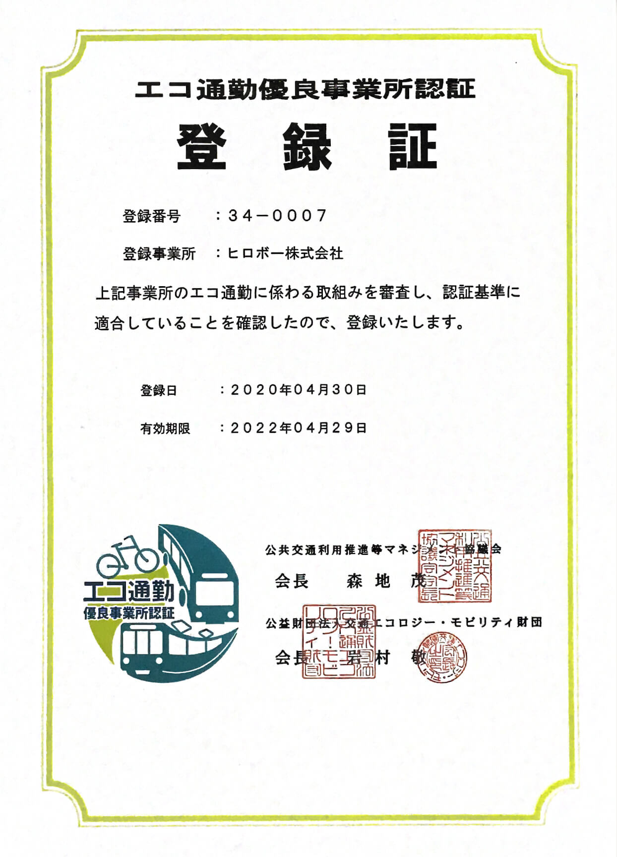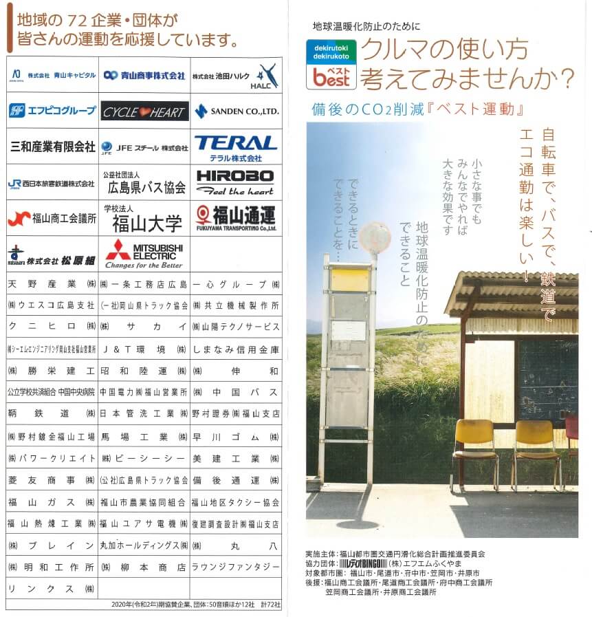 令和2年(2020年)4月30日、広島県府中市の事業所としては初めて、国土交通省などにより構成される公共交通利用促進等マネジメント協議会及び光栄記者団法人 交通エコロジー・モビリティ財団より「エコ通勤優良事業所」として認証を受けました。